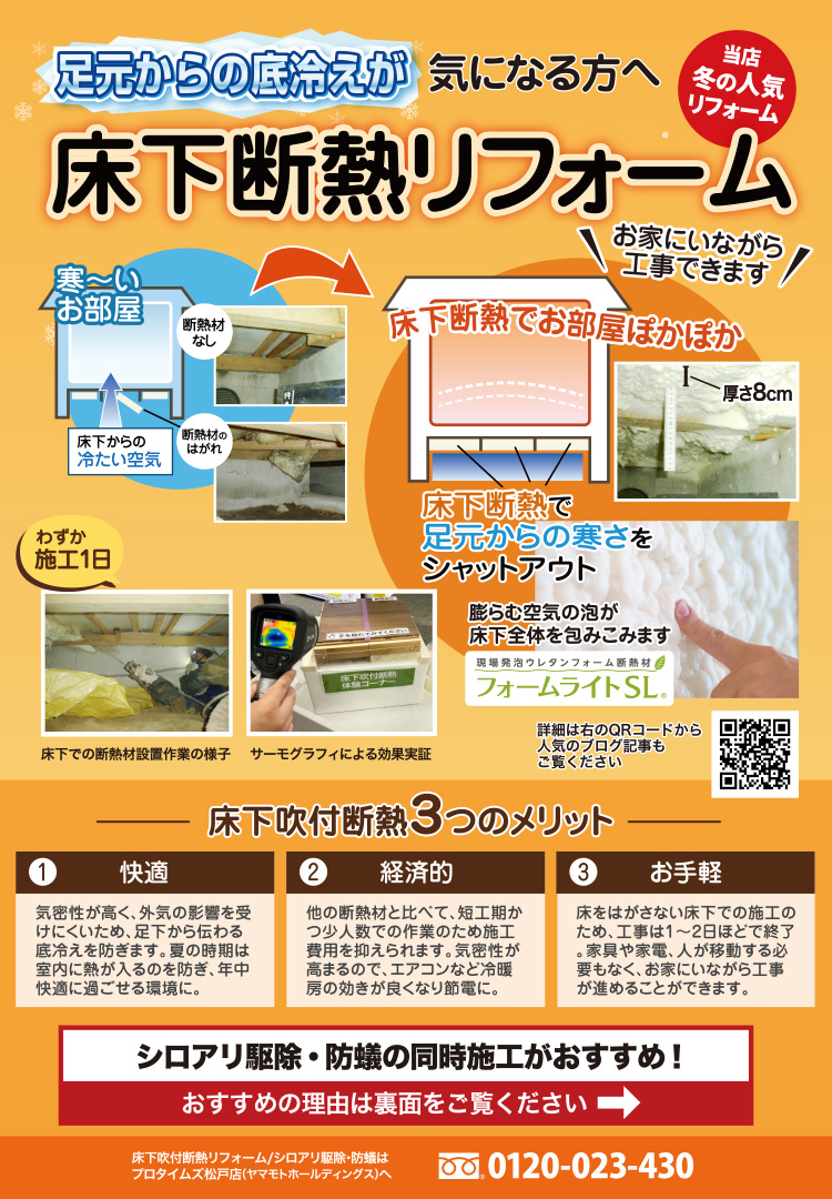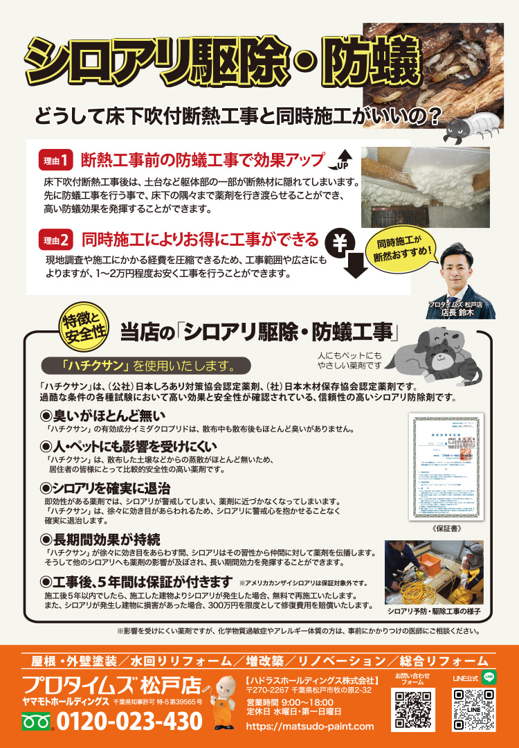 「床下吹付断熱」「シロアリ駆除・防蟻」チラシのPDFはこちら