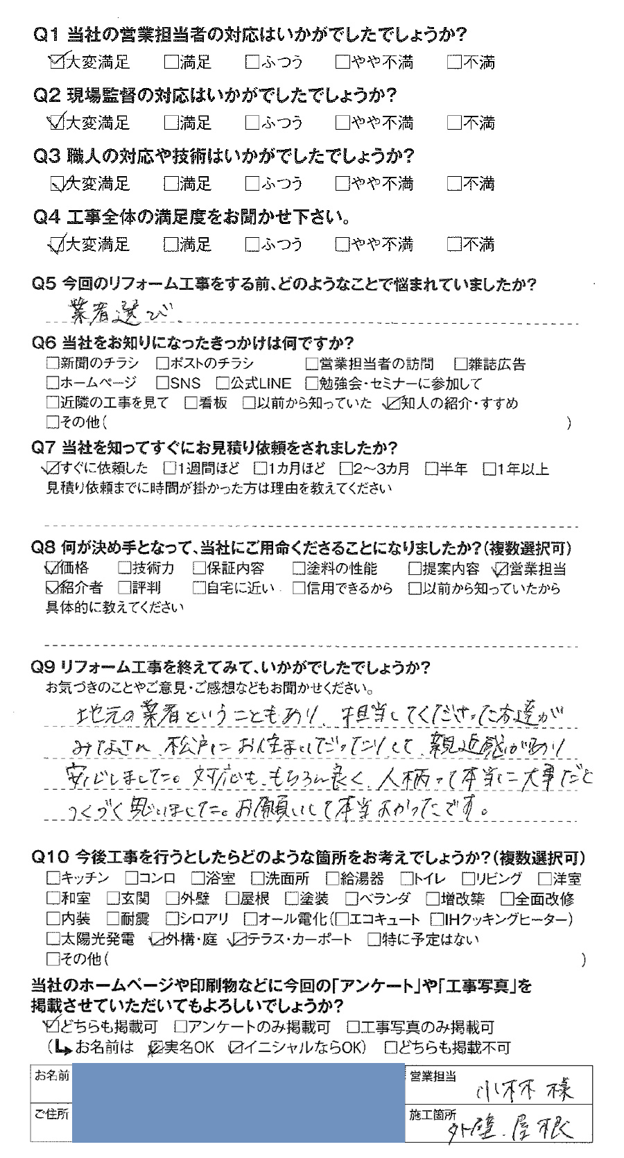 今後、10年間の無料点検サービスがございますので、今後とも、どうぞよろしくお願いいたします。塗装以外でも、リフォームや修理・修繕、お家の困ったことがございましたらお気軽にご相談ください。