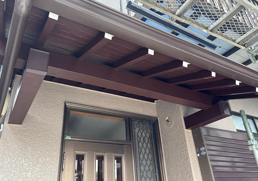 破風板・鼻隠し、軒天、雨樋交換・破風板金巻き工事、雨戸、戸袋、小庇、換気フード、パネル、軒天補修、Vカット補修、玄関ポーチ桁、他