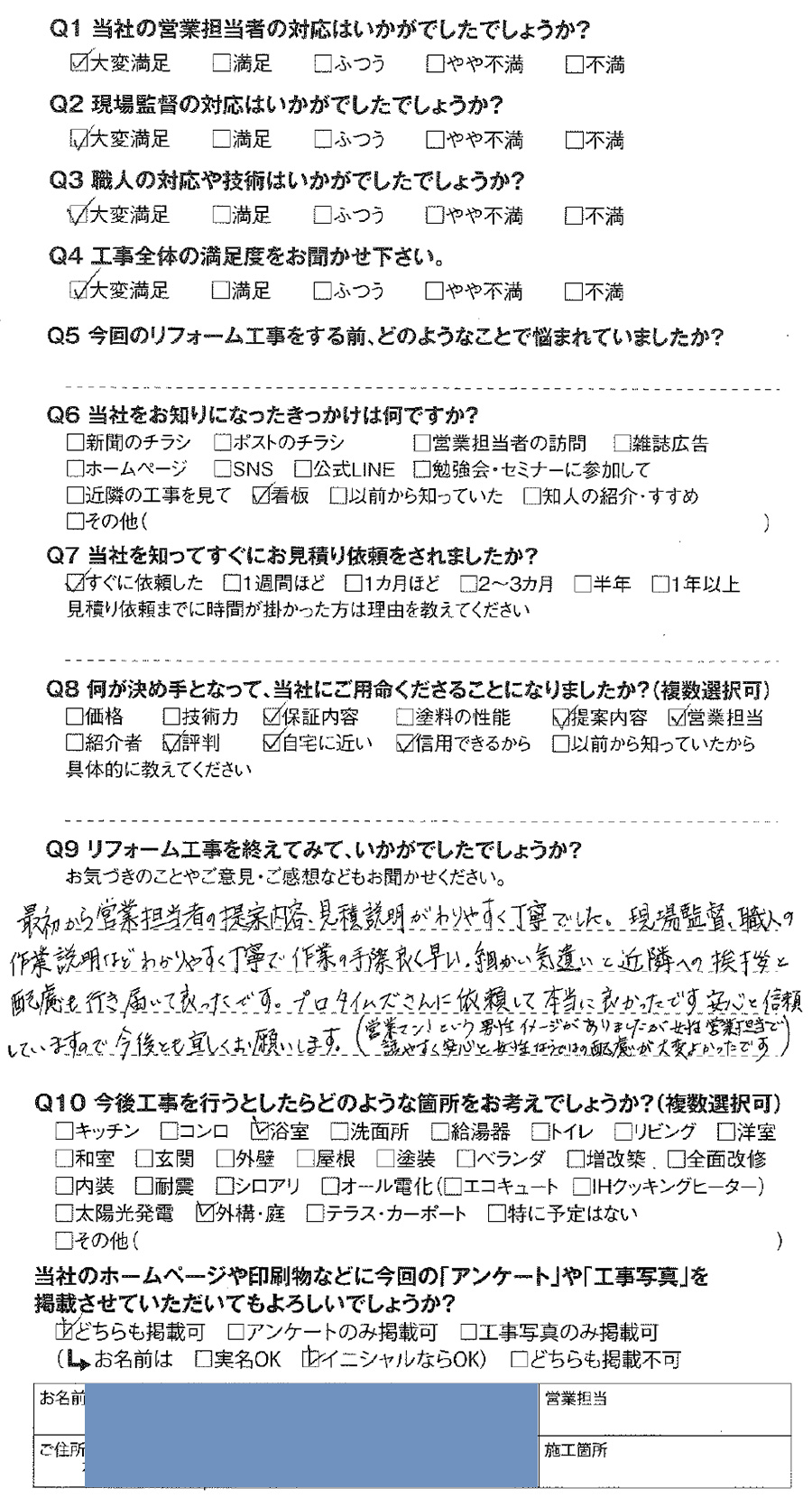 最初から営業担当者の提案内容・見積説明がわかりやすく丁寧でした。現場監督、職人の作業説明などわかりやすく丁寧で、作業の手際良く早い、細かい気遣いと近隣への挨拶と配慮も行き届いて良かったです。プロタイムズさんに依頼して本当に良かったです。安心と信頼していますので、今後とも宜しくお願いします。